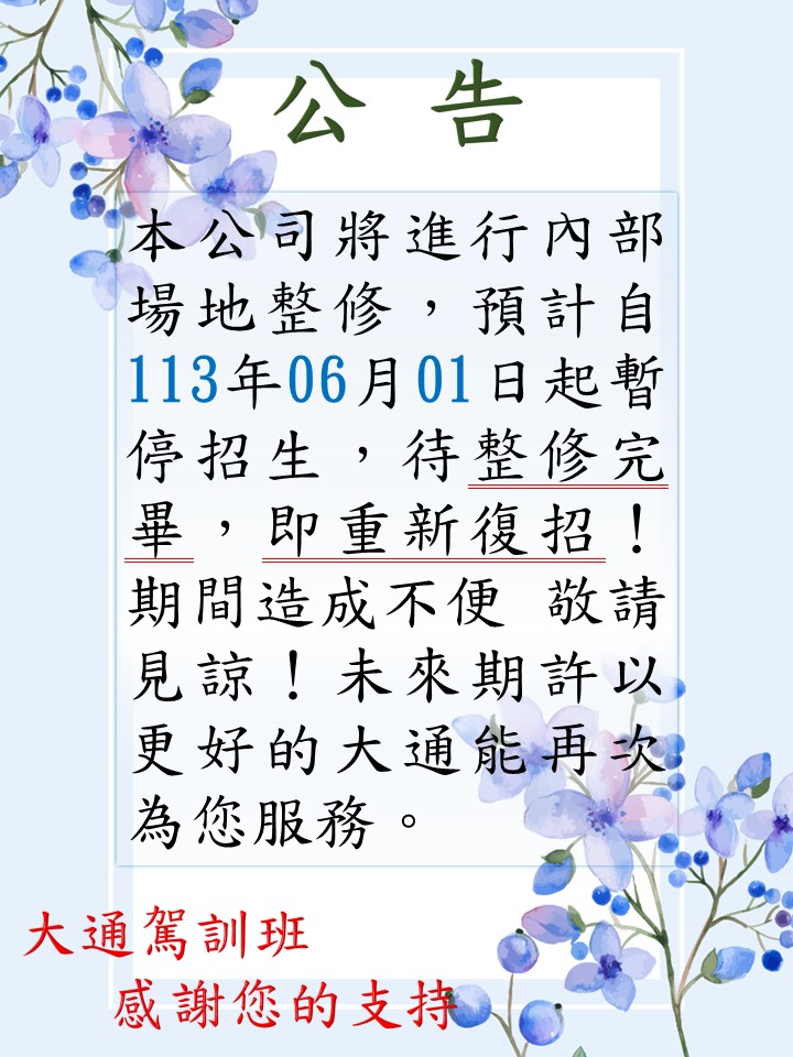 | 687 | B | 113.06.07(暫時停招) | 113.07.15 | 大通駕訓班 歡迎您 03-4928835 | |||